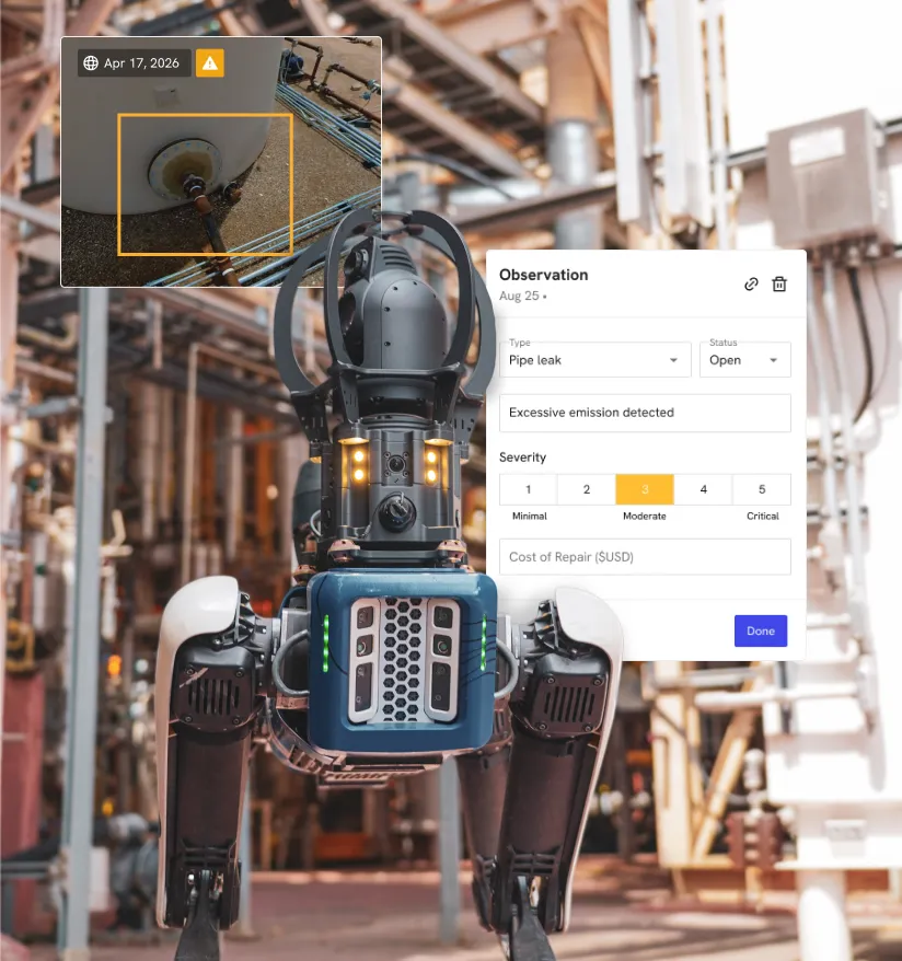 Deploy docked drones and ground robots to capture routine inspections automatically. Keep an always‑current visual record of critical equipment, even when sites are difficult or expensive to access.